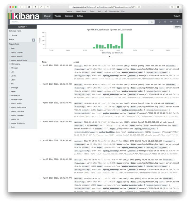 cat >> /etc/yum.repos.d/logstash-forwarder.repo <> /etc/logstash-forwarder.conf << FORWARD { The network section covers network configuration :) “network”: { “servers”: [ “elk.mckendrick.io:5000” ], “timeout”: 15, “ssl ca”: “/etc/pki/tls/certs/logstash-forwarder.crt” },