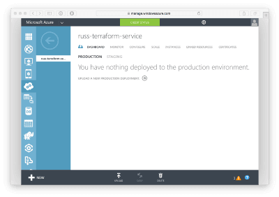 Once you have your certificate file it’s time to upload it. This is where things got confusing, the only obvious place I could find clicking around the interface was Settings -> Management Certificates which made complete sense to me coming from an AWS background. I uploaded it, launched my Virtual Machine using Terraform and it failed to find the thumbprint so it was back to Google.
