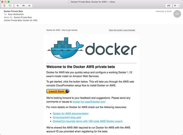 As you can see from the e-mail, Dockers AWS beta ships in two parts, the first being the Amazon Machine Image (AMI) which until general release is shared with your AWS account and the second part is a CloudFormation template.