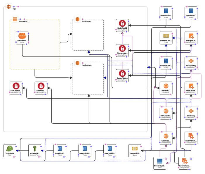 The CloudFormation template is where all of the hard work happens, as you can see from the rendering of the template below, taken from the CloudFormation visual editor, it sets up quite a few AWS services …