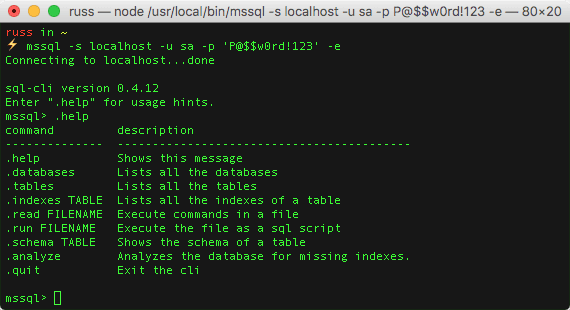 mssql -s localhost -u sa -p 'P@$$w0rd!123' -e