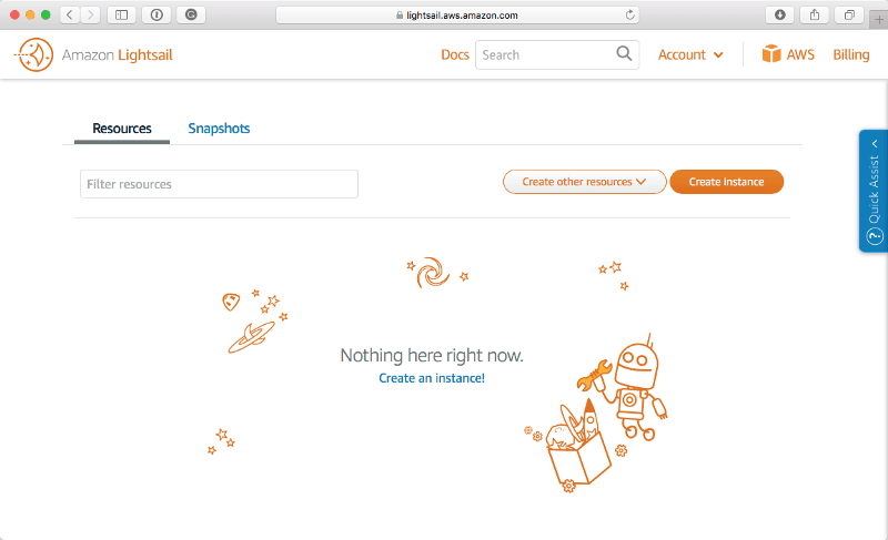 Lets walk through launching an Instance with Amazon Lightsail. When you first login you are present with a much friendlier welcome than the overwhelming AWS Console;