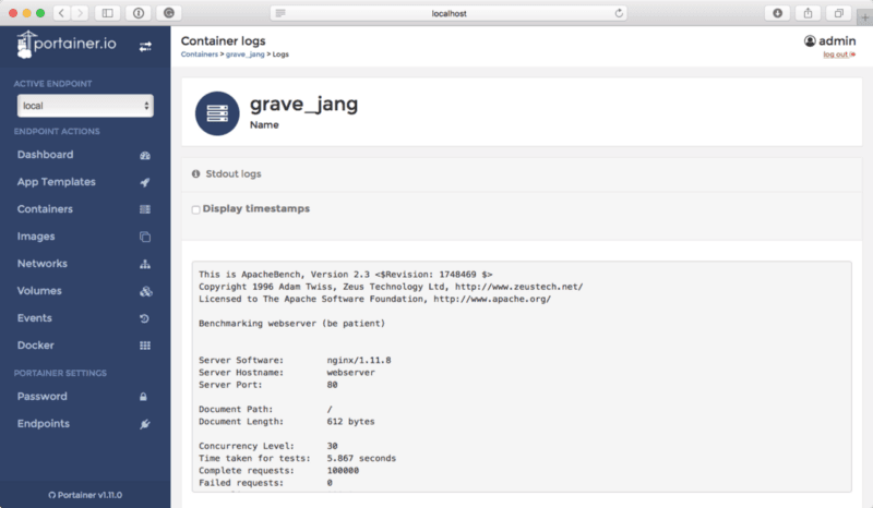 Clicking on its name and then logs will show you the results of the Apache Bench run;