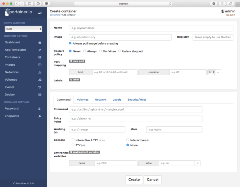 Now that Portainer is running you should be able to open your browser and enter http://localhost:9000/; you will be greeted by a screen which asks you to set a password for the admin user;