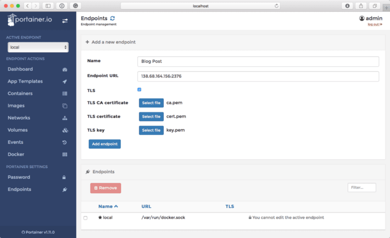 Return to your Portainer installation and click on Endpoints, click TLS and upload your certificates and give the endpoint details as per the screen below;
