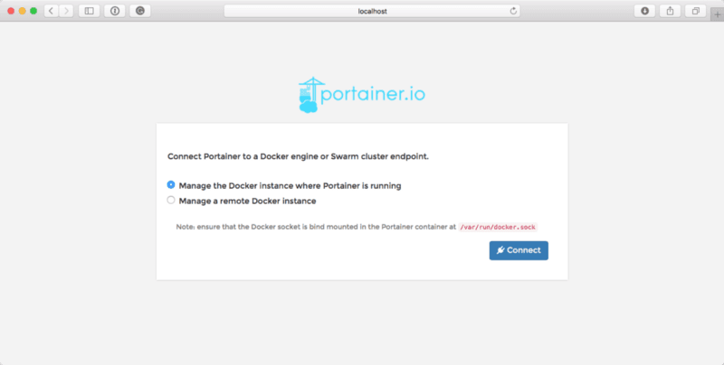 Once logged in you will be taken to the initial configuration page where you will be asked to choose between managing the Docker host where the Portainer is running a remote Docker host, for now, select the local Docker instance where Portainer is running and click on Connect;