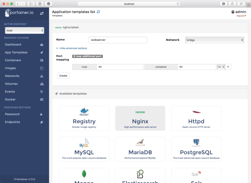Then choose one of the templates presented, here I am going to launch a NGINX container, click on Show advanced options allows you to map the ports;