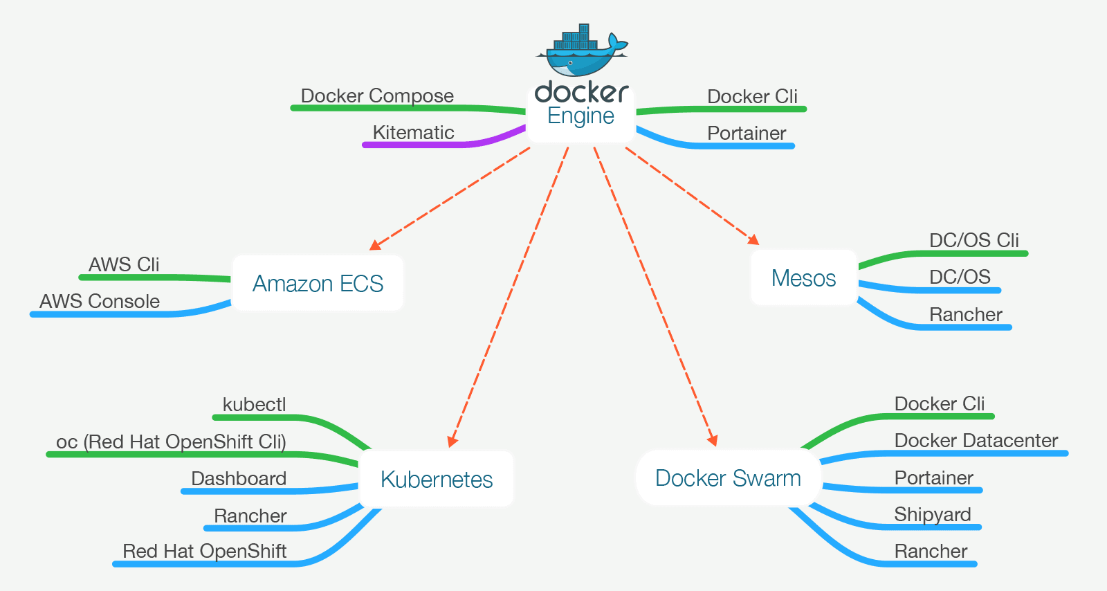 As you can see, at the top we have the Docker Engine which would be running on a single host. You then have your orchestration/scheduler interacting, with typically, several Docker Engines.
