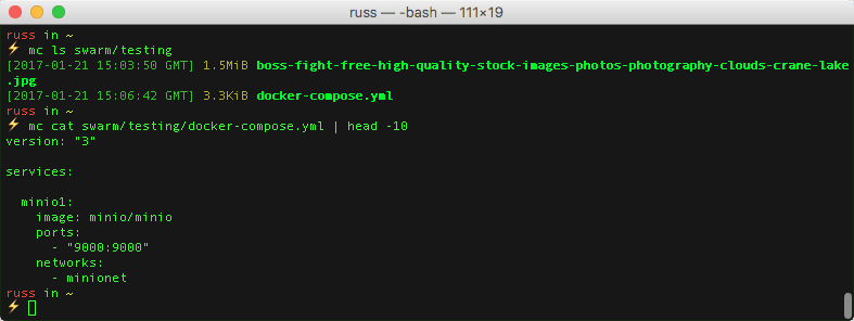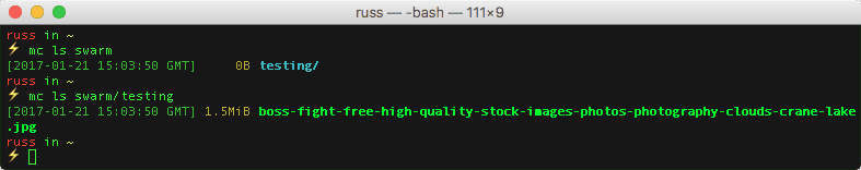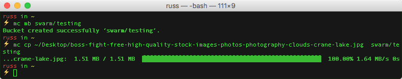 mc mb swarm/testingmc cp ~/Desktop/boss-fight-free-high-quality-stock-images-photos-photography-clouds-crane-lake.jpg swarm/testingI creatively called the bucket “testing”, and the file was the header graphic for this post.
