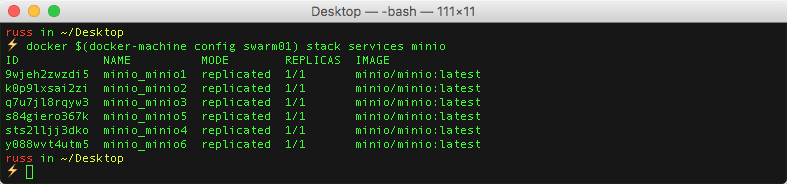 docker $(docker-machine config swarm01) stack services minioAs you can see from the terminal output below, I had the six services with each service having one of one containers running;