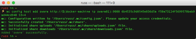 mc config host add swarm http://$(docker-machine ip swarm01):9000 6b4535c9d0545e036d5a f50a73124f5699570beb9ad44cd940 S3v4It added a host called swarm which can be contacted at any of the public IP addresses of my Swarm cluster (I used swarm01), accessed with the access & secret key and finally the host I am connecting to is running the S3v4 API.