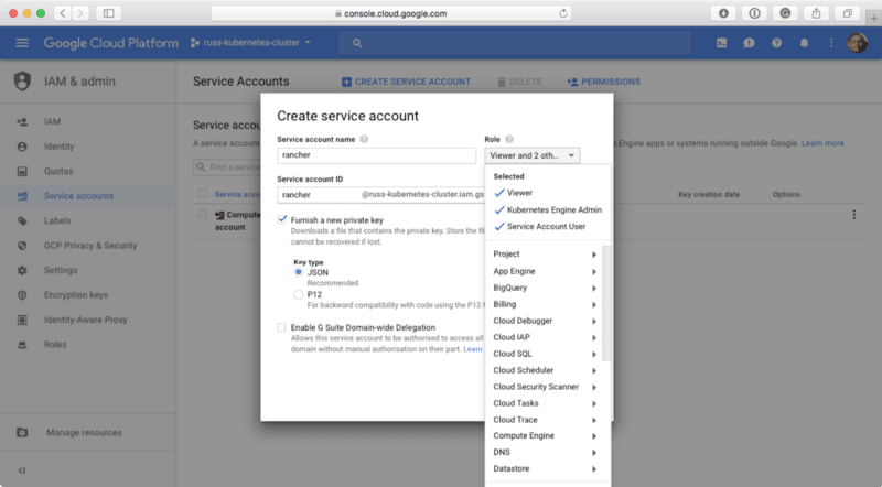 So I guess that means I will launching my cluster using Google’s Container Engine. To do this I needed to create a service account by follwing the on-screen instructions;