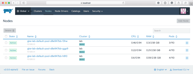 I enter the Name of my cluster as lab and kept the rest options at their defaults, meaning that Rancher would launch a three node n1-standard-1 (1 vCPU, 3.75GB RAM 100GB HDD) cluster in us-central1-f.