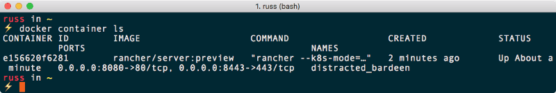 $ docker container run -d \ --restart=unless-stopped \ -p 8080:80 \ -p 8443:443 \ rancher/server:previewI checked that the container was up and running by running;