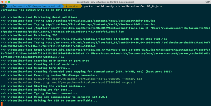 I took my CentOS 7 Packer configuration and tweaked it as the build process wasn’t different, the repo containing the CentOS 8 configuration can be found at https://github.com/russmckendrick/packer-centos8.