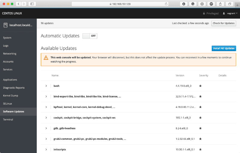 $ mkdir ~/centos8 $ cd ~/centos8 $ vagrant init russmckendrick/centos8 $ vagrant up