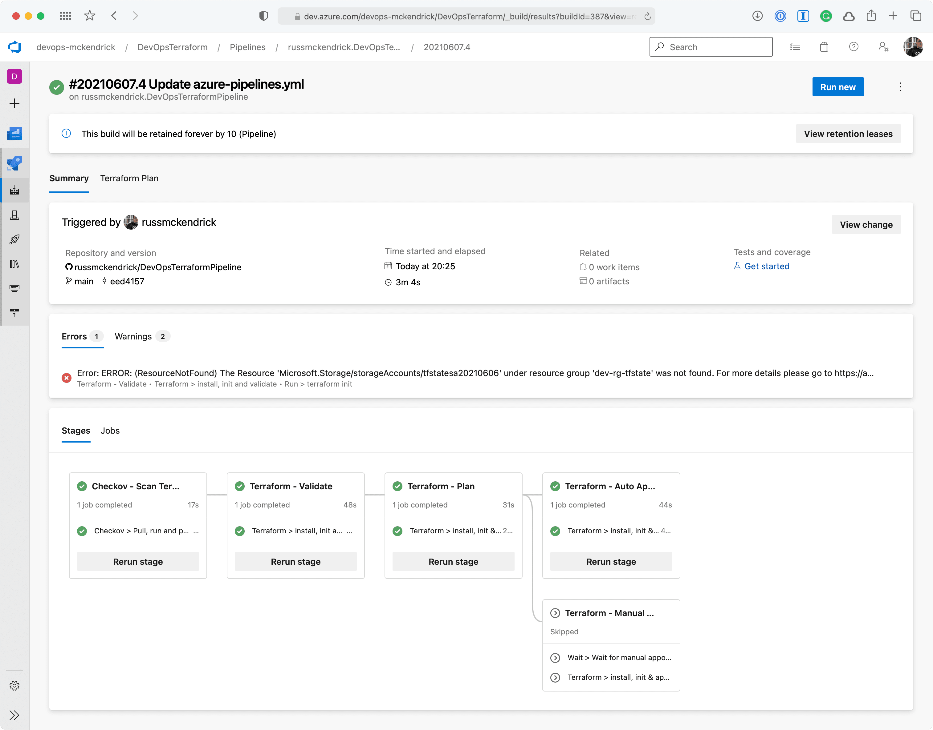 The pipeline itself has expanded a little and it now not only uses stages but also depending what Terraform is planning on doing it will trigger a manual approval process should there be any resources being destroyed.