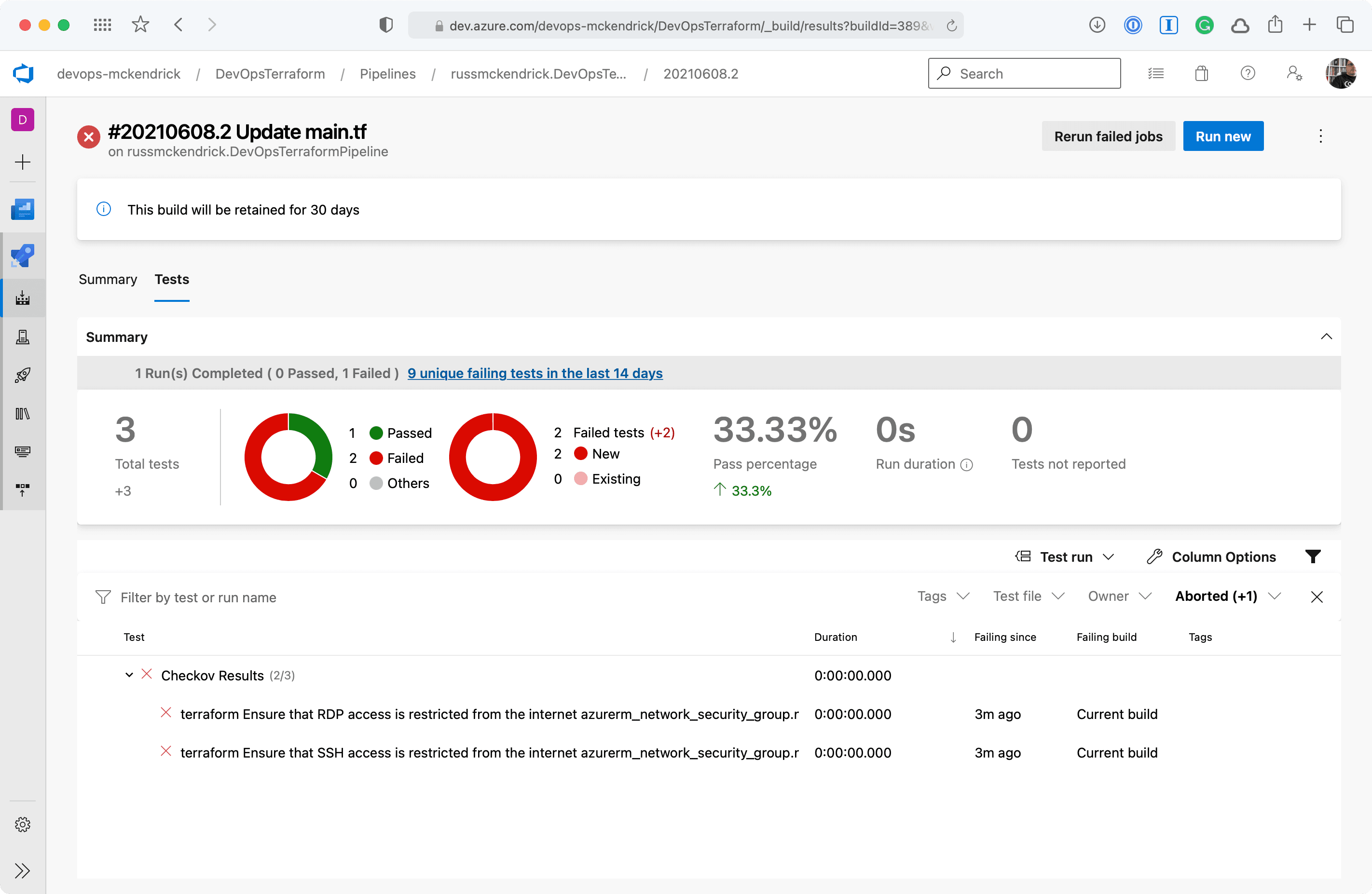 Whoops, the Checkov stage failed, clicking on Tests should give us more information as to why;