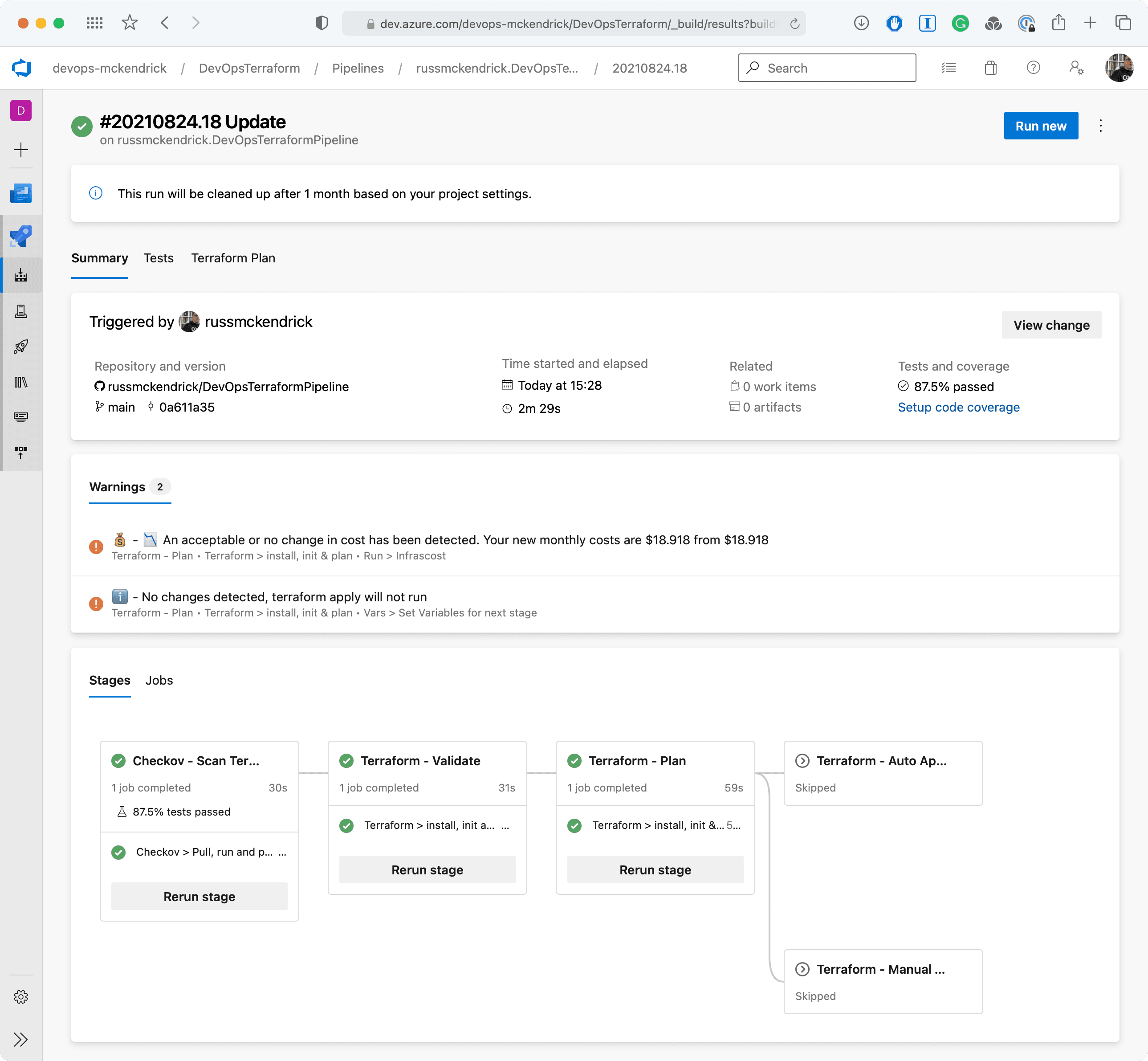 - **Checkov Scan**, there are no changes to [this stage](/2021/06/08/azure-devops-terraform-pipeline-with-checkov-approvals/#stage-checkovscan)- **Terraform Validate**, there are no changes to [this stage](/2021/06/08/azure-devops-terraform-pipeline-with-checkov-approvals/#stage-terraform-validate)- **Terraform Plan**, there is where all of the changes are and we will be covering this stage in more detail below.- **Terraform Apply (Auto Approval)**, there are no changes to [this stage](/2021/06/08/azure-devops-terraform-pipeline-with-checkov-approvals/#stage-terraform-apply-auto-approval)- **Terraform Apply (Manual Approval)**, there are some minor changes to [this stage](/2021/06/08/azure-devops-terraform-pipeline-with-checkov-approvals/#stage-terraform-apply-manual-approval), mostly around the wording