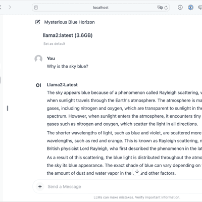 curl -X POST http://localhost:11434/api/generate -d '{ "model": "llama2", "prompt":"Why is the sky blue?", "stream": false }'After a second or two, a response is returned: