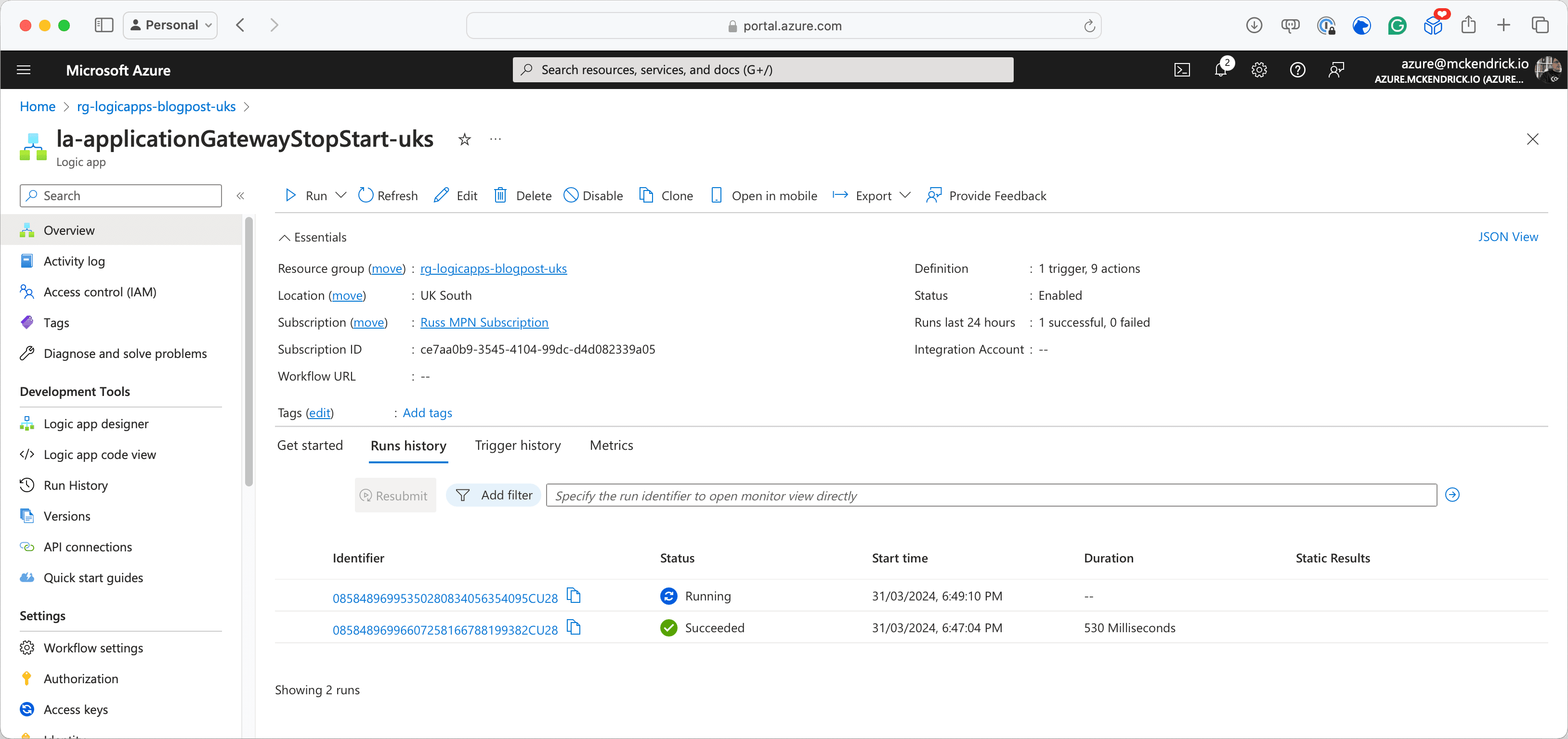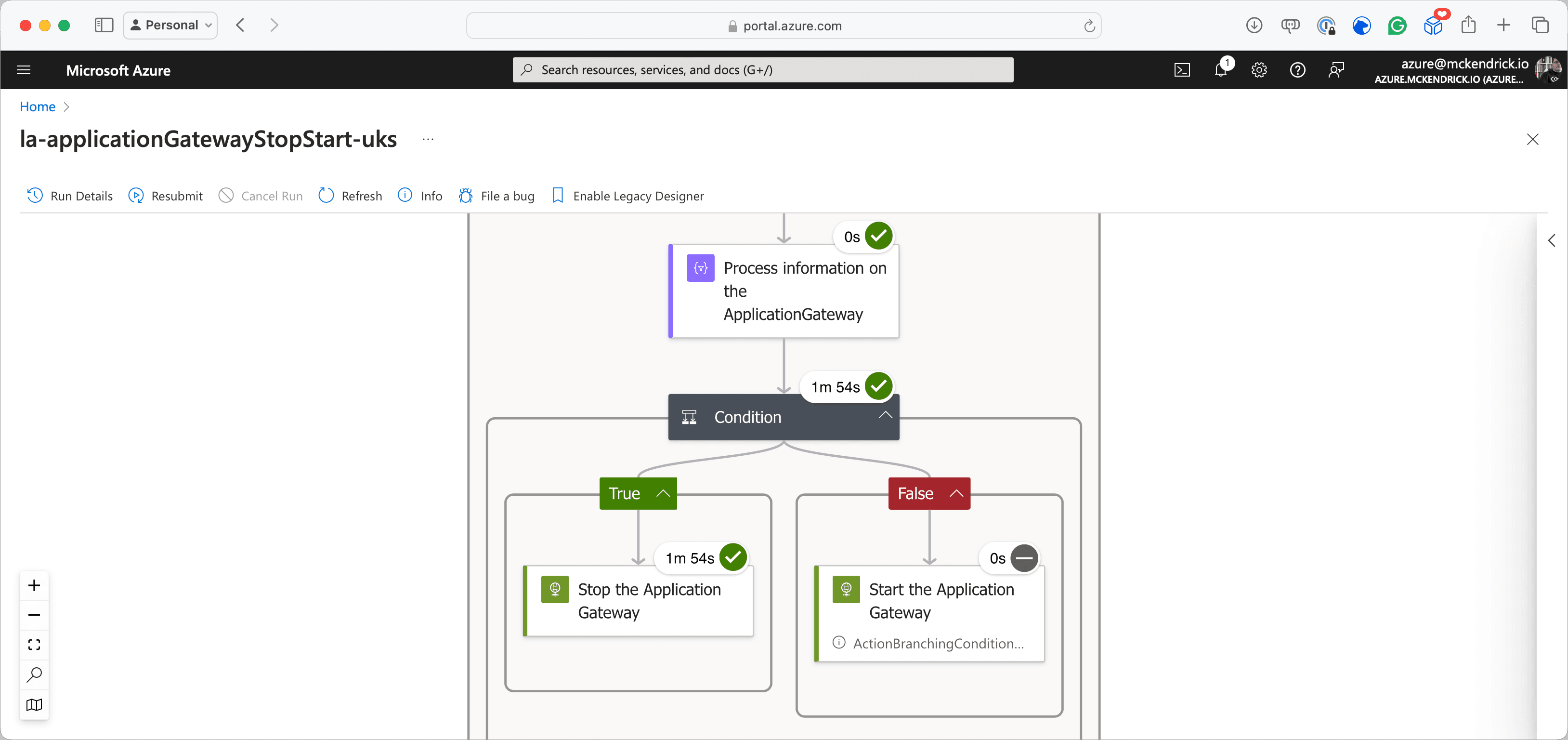 As the Azure Application Gateway was running when we ran the Azure Logic App the first time, the run stopped the Application Gateway: