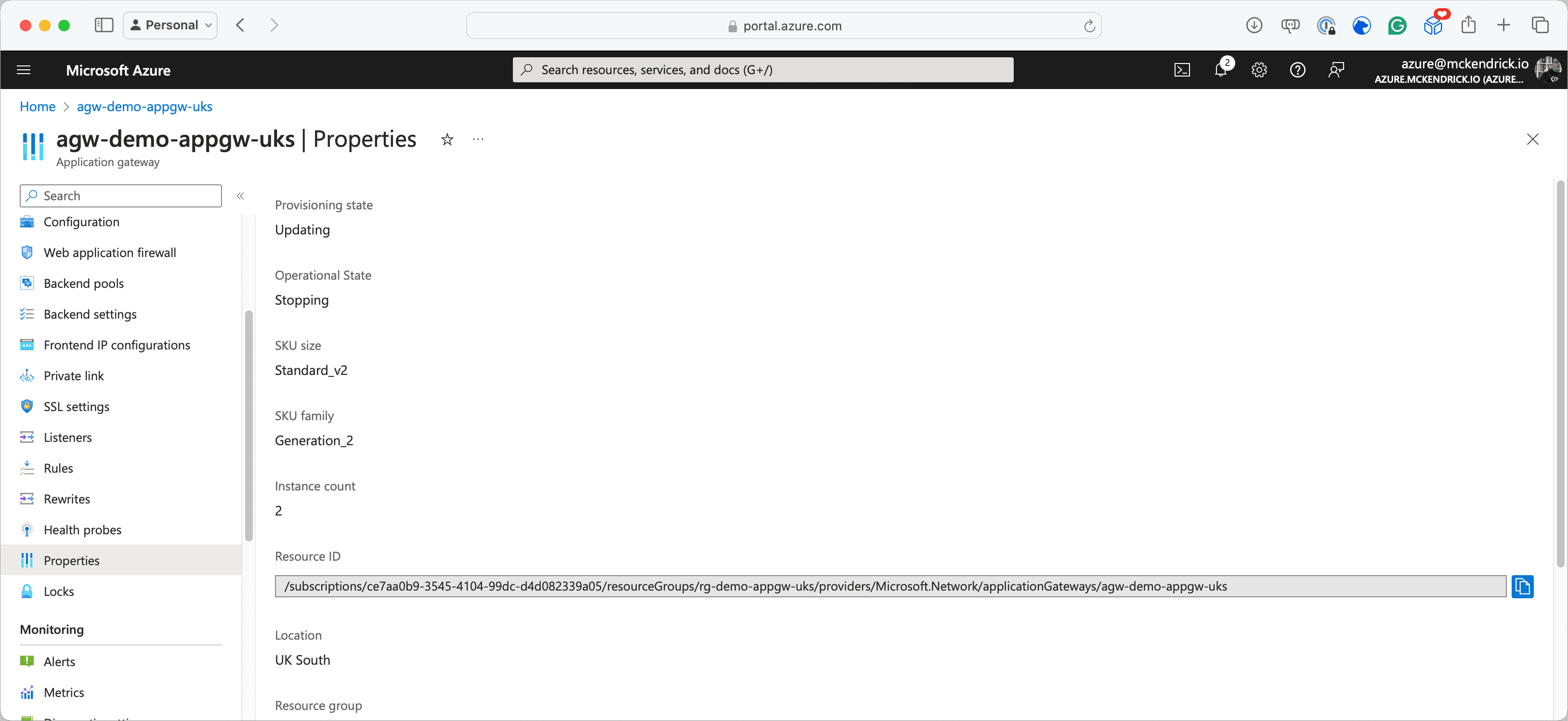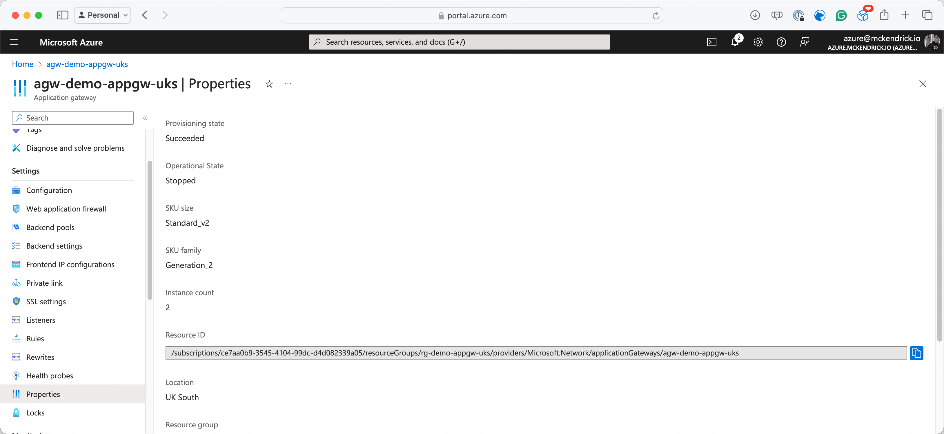 As you can see from the screens above, the Azure Logic App ran, and because the Application Gateway had an Operational State of Running, it Stopped the Azure Application Gateway. You can check the Operational State by going to the Azure Application Gateway in the Azure portal and going to Properties in the left-hand menu.