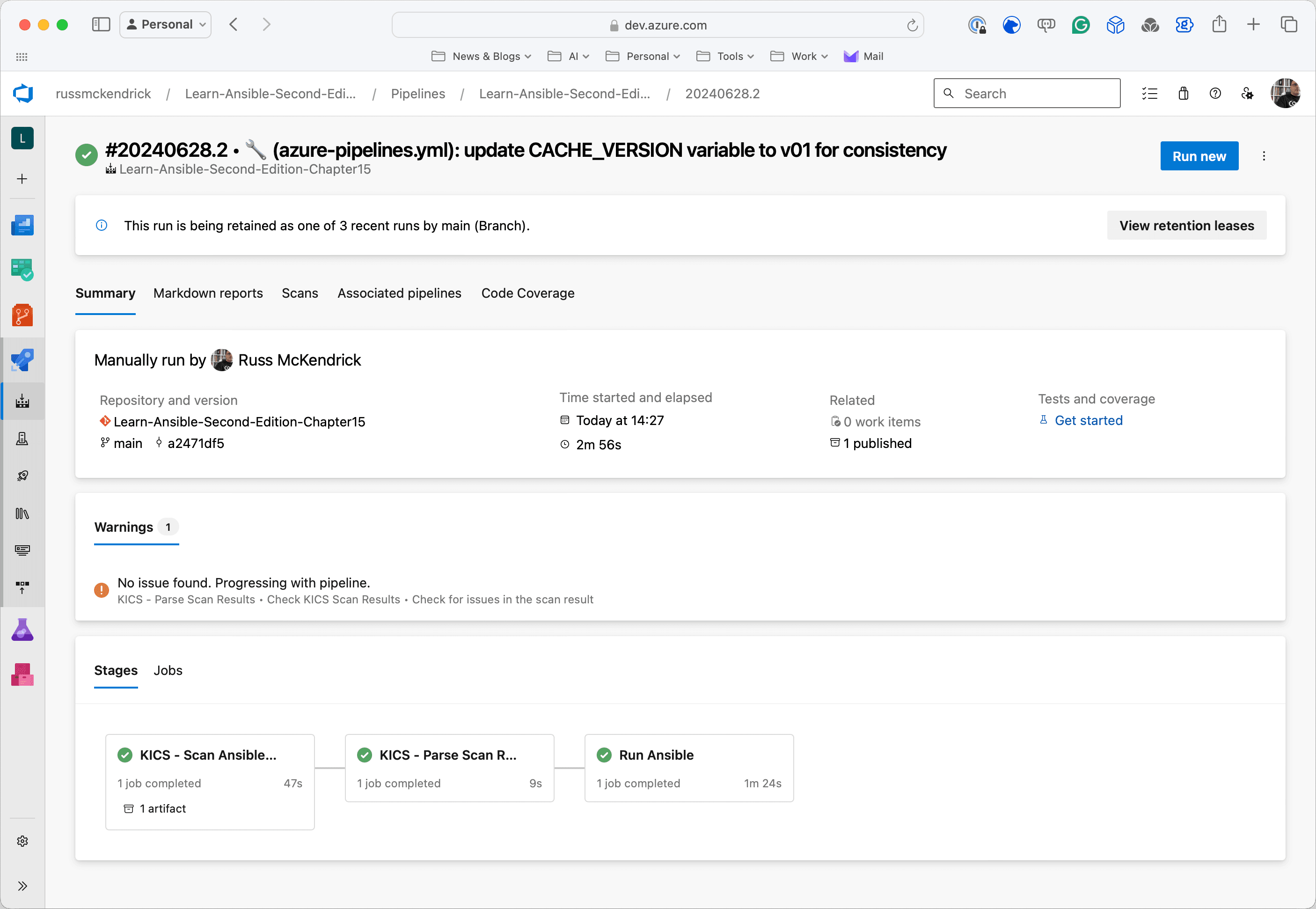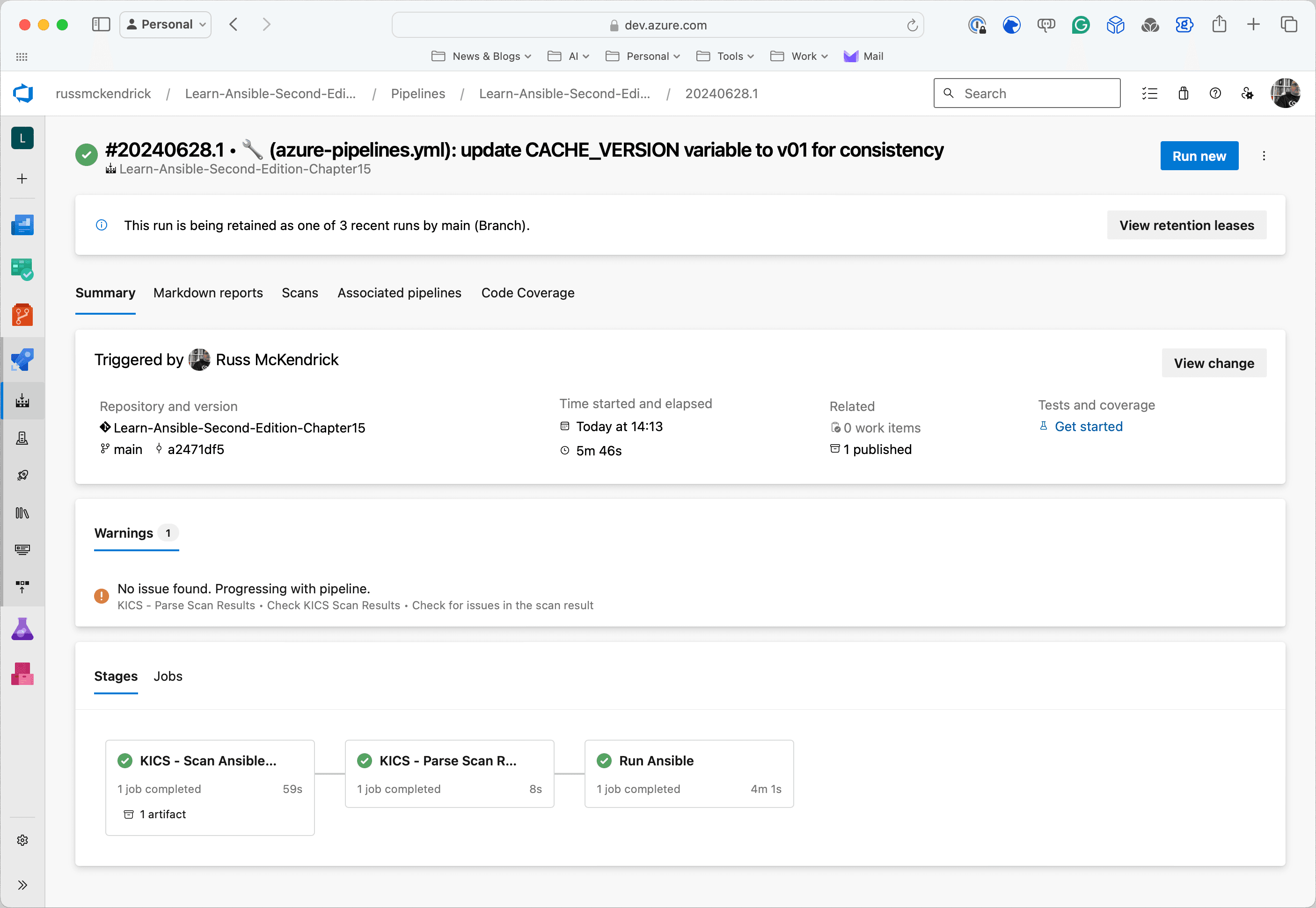 For those of you who haven’t read the second edition of Learn Ansible, this updated Azure DevOps pipeline automates the secure deployment of Ansible playbooks by first running a KICS (Keeping Infrastructure as Code Secure) scan to identify potential security vulnerabilities in the infrastructure code. It then parses the scan results to determine whether it’s safe to proceed with the deployment, setting a flag to either continue or halt the pipeline based on the severity of any issues found.
