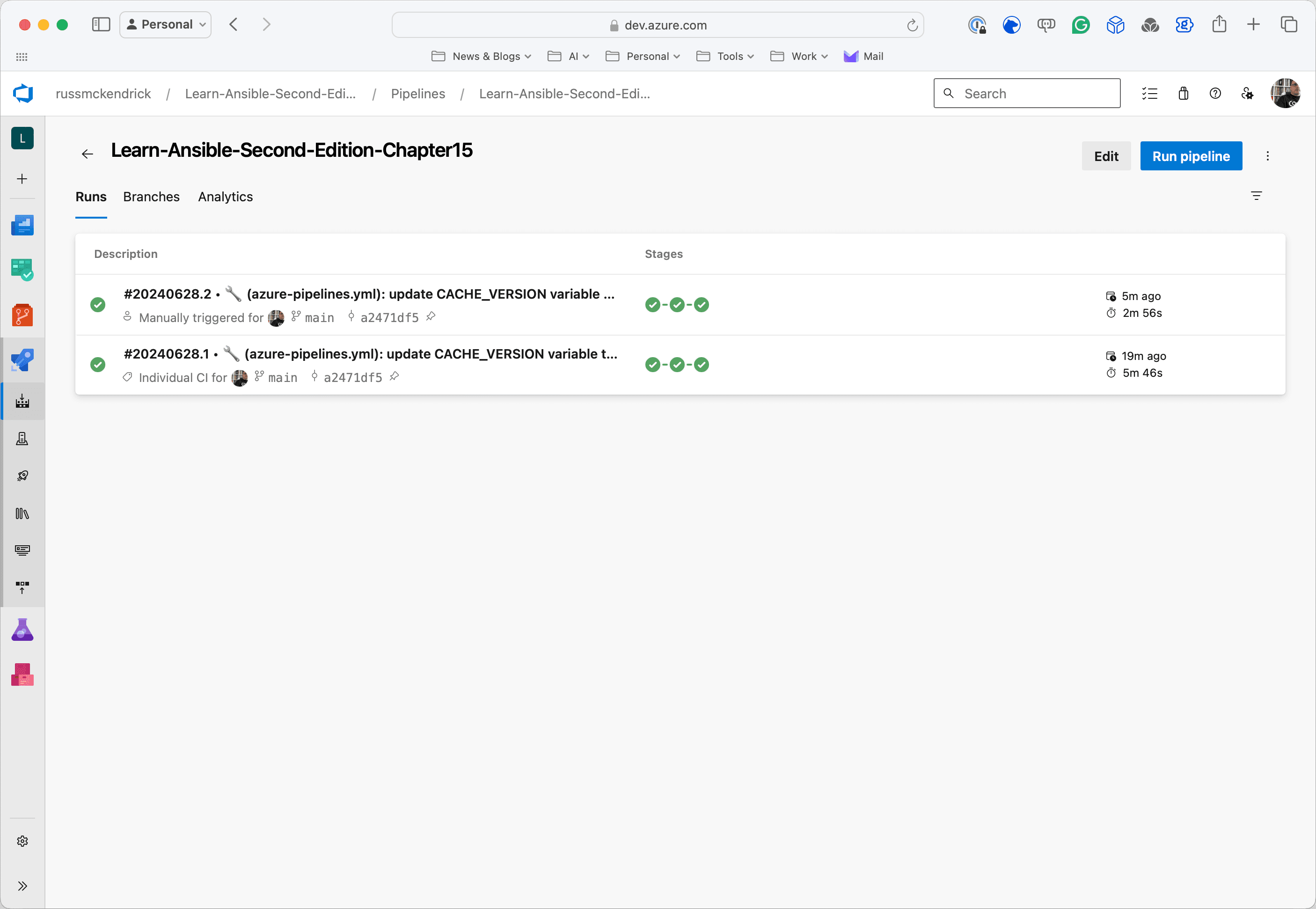 Fast forward four years, I updated the pipeline for Chapter 15 of the second edition of Learn Ansible; this version of the pipeline, which is covered in detail in the book, can be found in the repo linked below;