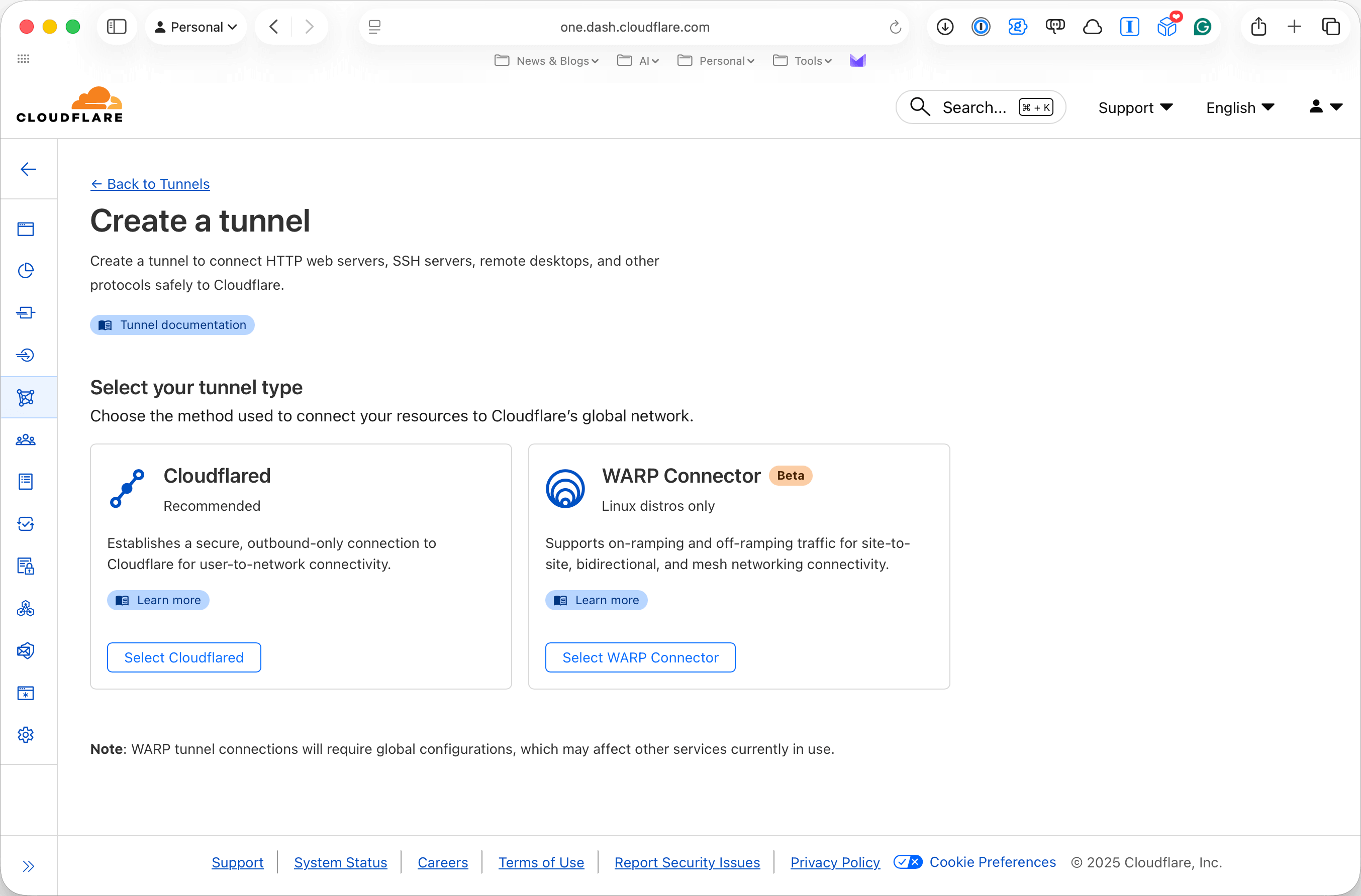 To do this signup for their Zero Trust service, using the free tier is fine, once you have signed up you need to create a new tunnel, you can this by going Network > Tunnels > Create a Tunnel.