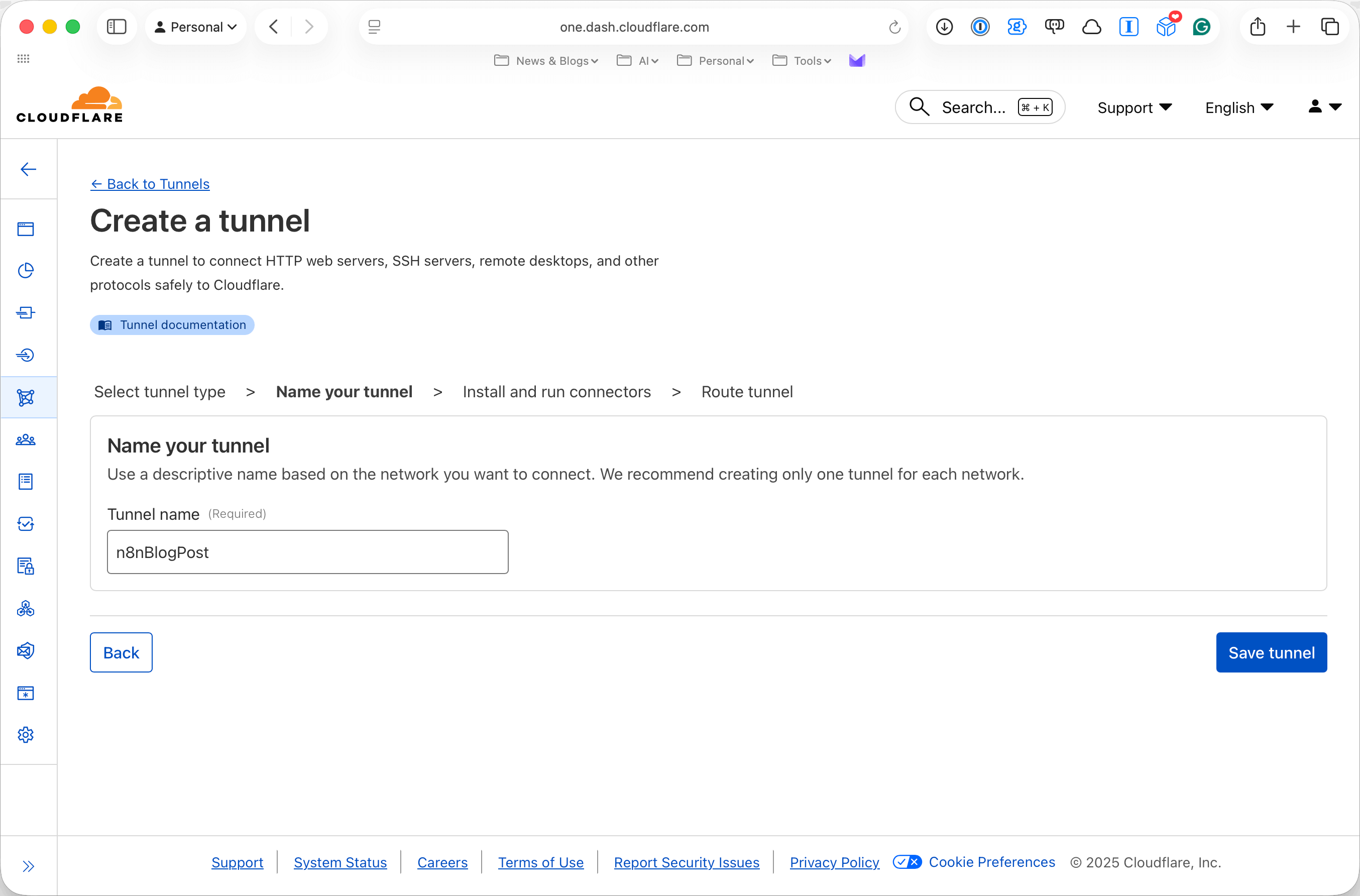 I host all of my domains via Cloudflare (as well as this blog) so using their Tunnel service for routing the traffic to my local n8n instance was a no-brainer.