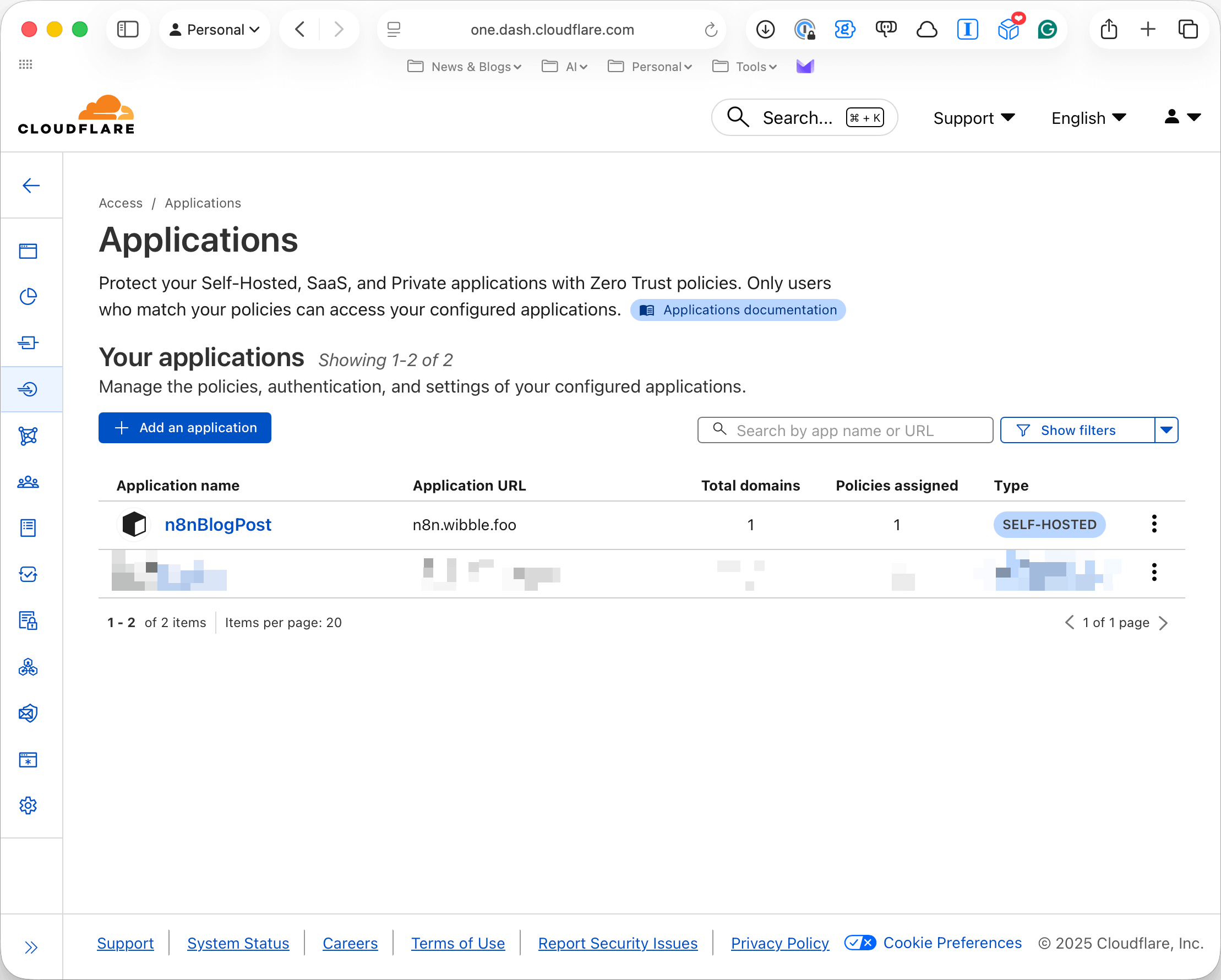 Given that we are running the n8n instance on a local resource, and the tunnel is exposing it to the internet, we can make it a little more secure by fronting the site with a Cloudflare Zero Trust login. This will prevent anyone from accessing the n8n instance without being validated via Cloudflare.