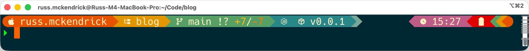 Your terminal prompt is personal - it should reflect how you work and what information you need at a glance. My Starship configuration has evolved from when I was using PowerLine10k and will continue to be added to as time goes on.