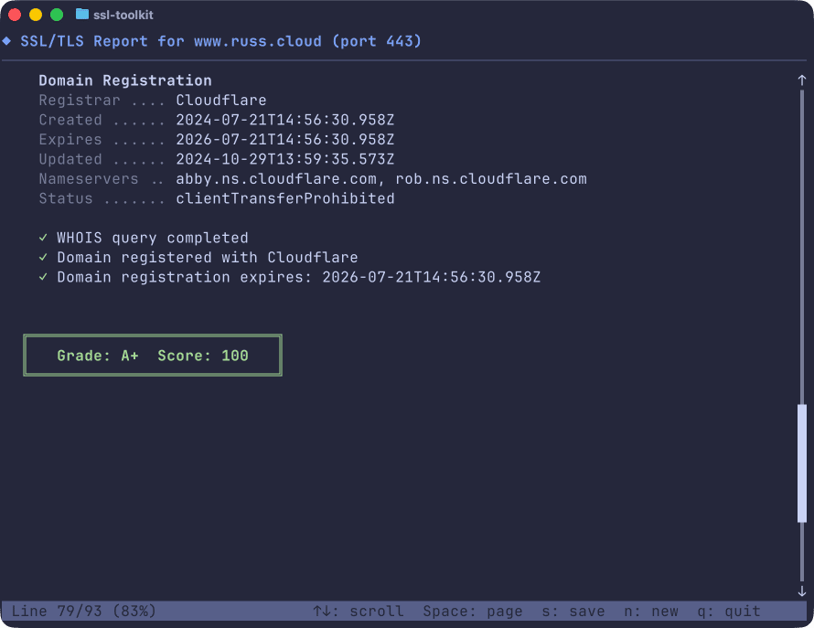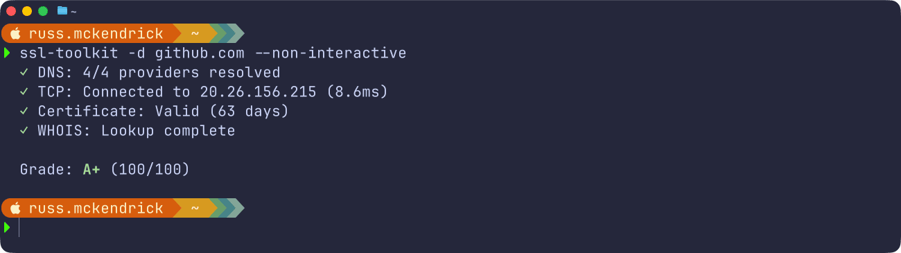 ssl-toolkit -d www.russ.cloud --json --non-interactiveThis gives you the following output: