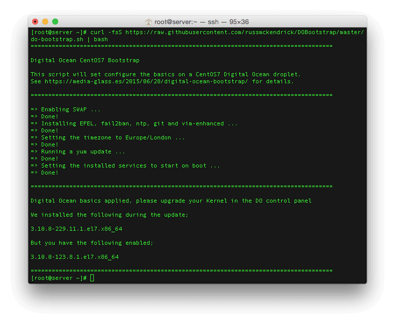 This process differs depending on the Operating System have chosen, but it is applicable to all of the CentOS droplets and Ubuntu versions below 15.04, not that I am running any Ubuntu servers.