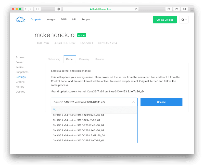 Once the script has been run you should power down your droplet from within the control panel by selecting your droplet, then enter the Power menu, hit the “Power off” button to power down your droplet. While the droplet is powered off goto “Settings” and the switch to the “Kernel” tab, from there select the kernel you would like your droplet to use (in the example above its 3.10.0–229.11.1.el7.x86_64) and click the “Change” button;