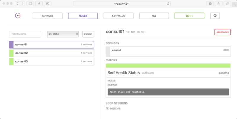 2016/02/27 17:07:50 [INFO] serf: EventMemberJoin: consul01 10.131.5.982016/02/27 17:07:50 [INFO] serf: EventMemberJoin: consul01.dc1 10.131.5.982016/02/27 17:07:50 [INFO] raft: Node at 10.131.5.98:8300 [Follower] entering Follower state2016/02/27 17:07:50 [INFO] consul: adding LAN server consul01 (Addr: 10.131.5.98:8300) (DC: dc1)2016/02/27 17:07:50 [INFO] consul: adding WAN server consul01.dc1 (Addr: 10.131.5.98:8300) (DC: dc1)2016/02/27 17:07:50 [ERR] agent: failed to sync remote state: No cluster leader2016/02/27 17:07:52 [WARN] raft: EnableSingleNode disabled, and no known peers. Aborting election.2016/02/27 17:08:09 [ERR] agent: failed to sync remote state: No cluster leader2016/02/27 17:08:12 [ERR] agent: coordinate update error: No cluster leader2016/02/27 17:08:29 [ERR] agent: failed to sync remote state: No cluster leader2016/02/27 17:08:41 [ERR] agent: coordinate update error: No cluster leader2016/02/27 17:08:50 [ERR] agent: failed to sync remote state: No cluster leader2016/02/27 17:09:01 [INFO] agent.rpc: Accepted client: 127.0.0.1:442342016/02/27 17:09:01 [INFO] agent: (LAN) joining: [10.131.5.98 10.131.4.80 10.131.9.106]2016/02/27 17:09:01 [INFO] serf: EventMemberJoin: consul02 10.131.4.802016/02/27 17:09:01 [INFO] consul: adding LAN server consul02 (Addr: 10.131.4.80:8300) (DC: dc1)2016/02/27 17:09:01 [INFO] serf: EventMemberJoin: consul03 10.131.9.1062016/02/27 17:09:01 [INFO] agent: (LAN) joined: 3 Err:2016/02/27 17:09:01 [INFO] consul: adding LAN server consul03 (Addr: 10.131.9.106:8300) (DC: dc1)2016/02/27 17:09:01 [INFO] consul: Attempting bootstrap with nodes: [10.131.4.80:8300 10.131.9.106:8300 10.131.5.98:8300]2016/02/27 17:09:01 [INFO] consul: New leader elected: consul032016/02/27 17:09:02 [INFO] agent: Synced service ‘consul’Finally, as the image has the Consul UI enabled, I could view my cluster in my browser by opening service-discovery01’s IP;