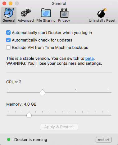 First of all you need to ensure that your Docker installation has at least 4GB of RAM assigned, as I am running Docker for Mac, all that I need to do is open up the Preferences and change the memory to 4GB;