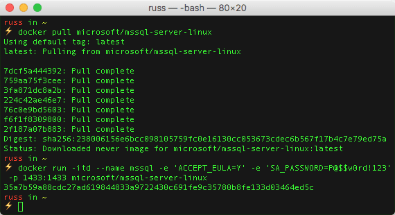 docker run -itd \ --name mssql \ -e 'ACCEPT_EULA=Y' \ -e 'SA_PASSWORD=P@$$w0rd!123' \ -p 1433:1433 \ microsoft/mssql-server-linux
