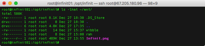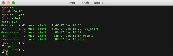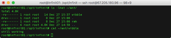 ls -lhat ~/mntcat ~/mnt/wibbleAs you should, the changes we made on our second instance have been immediately copied over and are available on our first instance.