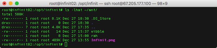 infinit-volume --create --as russ --network blogpost --name my-volume --pushNow that we have a volume we can mount it by running the following command;