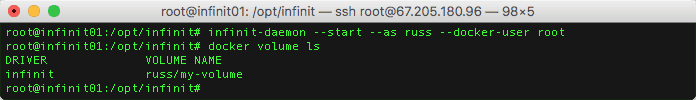 infinit-daemon --start --as russ --docker-user rootI have used the use root as that is the default user for the Digital Ocean instances I launched, and thats kind of it, the Docker plugin should now be installed and configured. To check simply run;