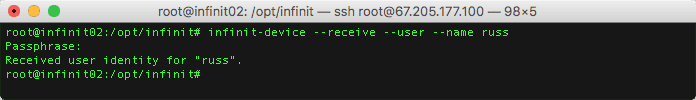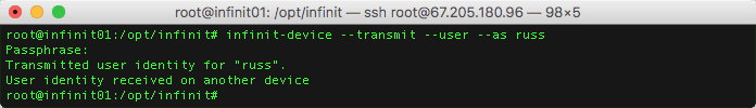 infinit-device --receive --user --name russYou will be asked for the passphrase you set on Instance #1 entered you should see something like the following;