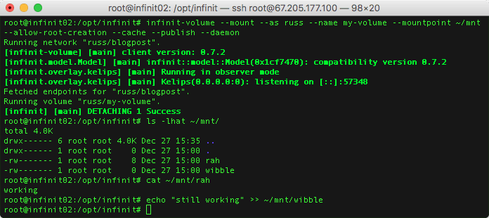 infinit-network --link --as russ --name blogpostNow that our instance has joined the network we can mount the volume by running the following as we did on our first instance;