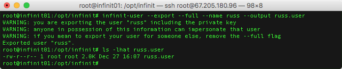 infinit-user --export --full --name russ --output russ.userAs per the output, it is important you keep the file safe, it is the equivalent of the private and public portions of an SSH key.