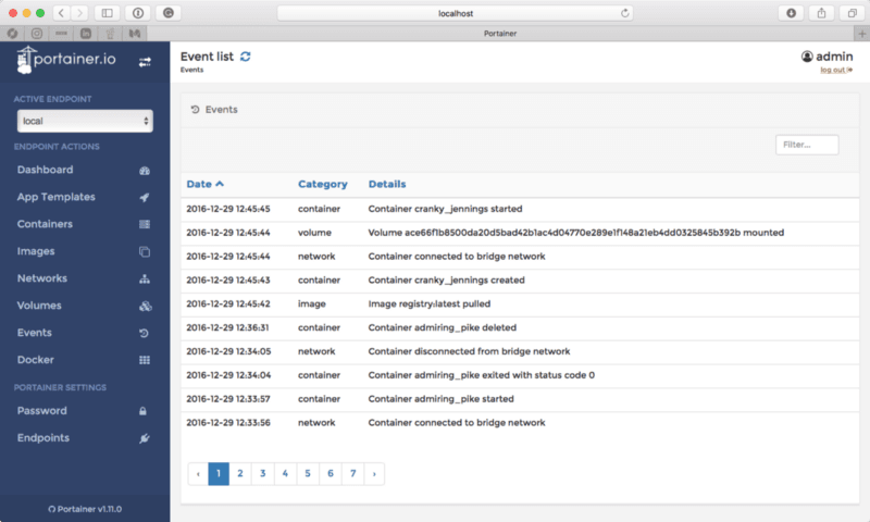 and finally you can get an audit trail of everything your Docker daemon has been up to by clicking on Events;