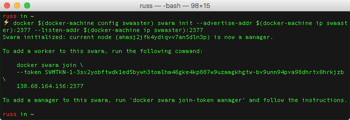 docker $(docker-machine config swmaster) swarm init --advertise-addr $(docker-machine ip swmaster):2377 --listen-addr $(docker-machine ip swmaster):2377