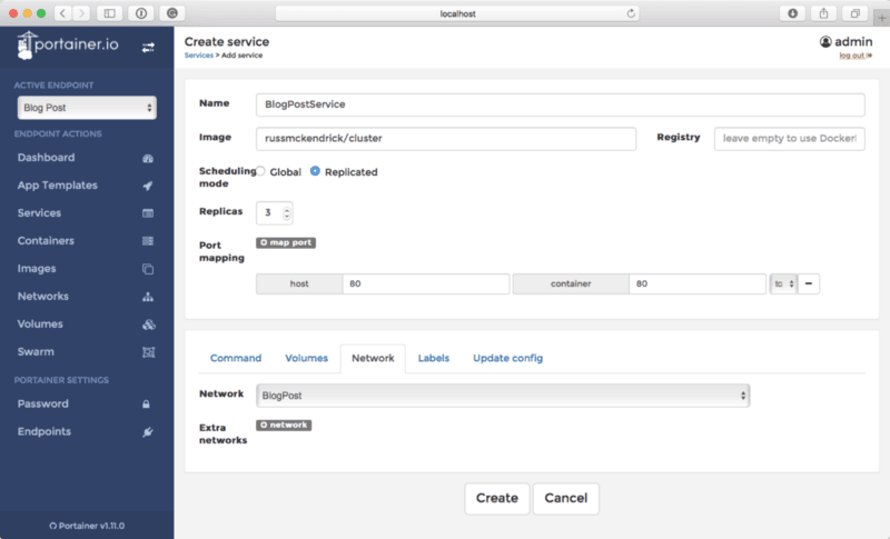 You can also add launch services by clicking Services. Before we launch a service we should create a network for our Service to launched into, click on Networks and then Create a network, I called mine “BlogPost”;