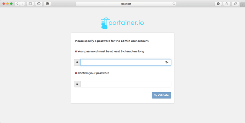 Now that Portainer is running you should be able to open your browser and enter http://localhost:9000/; you will be greeted by a screen which asks you to set a password for the admin user;