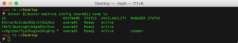 docker $(docker-machine config swarm01) swarm init --advertise-addr $(docker-machine ip swarm01):2377 --listen-addr $(docker-machine ip swarm01):2377SWMTKN=$(docker $(docker-machine config swarm01) swarm join-token -q worker)docker $(docker-machine config swarm02) swarm join $(docker-machine ip swarm01):2377 --token $SWMTKNdocker $(docker-machine config swarm03) swarm join $(docker-machine ip swarm01):2377 --token $SWMTKNThen the following to check that I have the three hosts in the cluster;