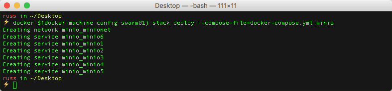 docker $(docker-machine config swarm01) stack deploy --compose-file=docker-compose.yml minioAs you can see from the terminal output above, six services and a network were created, as well as volumes which were created using the default volume driver.